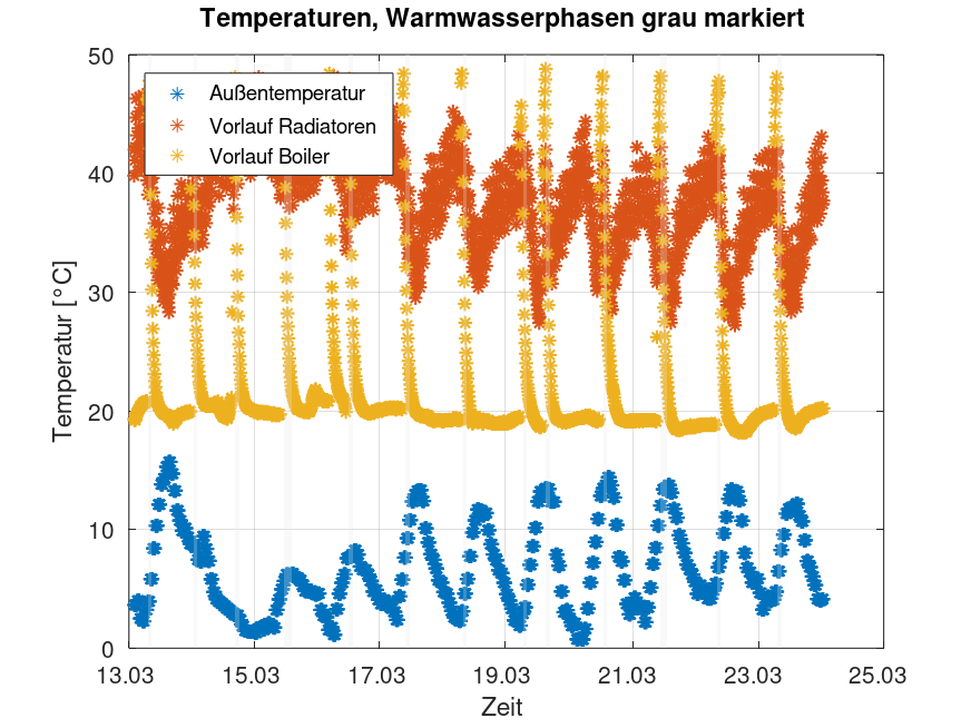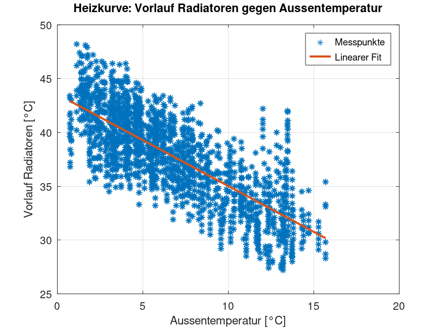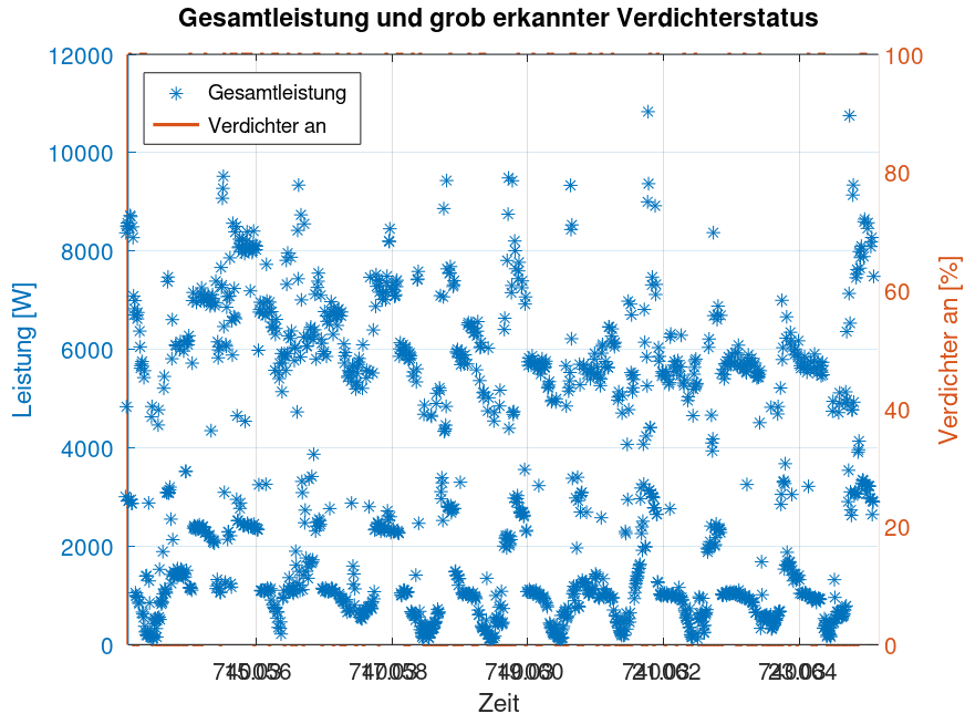 Auswertung power_temp.dat ======================== Anzahl Messpunkte: 1582 Median Messintervall: 10.0 min Gesamtdauer: 263.67 h Gesamtleistung Haus: Mittel: 3346.9 W Min : 111.7 W Max : 11059.6 W Aussentemperatur: Mittel: 6.72 °C Min : 0.73 °C Max : 15.69 °C Vorlauf Radiatoren: Mittel: 37.81 °C Min : 27.20 °C Max : 48.20 °C Vorlauf Boiler: Mittel: 22.45 °C Min : 18.20 °C Max : 48.80 °C Verdichter grob (Schwelle > 5000 W): Starts geschaetzt : 167 Starts pro Tag : 15.2 Laufzeit : 94.83 h Laufzeitanteil : 36.0 % Zyklusdauer Mittel: 0.57 h Zyklusdauer Min : 0.33 h Zyklusdauer Max : 1.67 h Elektrische Leistung waehrend Verdichter an: Mittel: 6461.7 W Min : 2308.8 W Max : 11059.6 W Warmwasserladung grob (Boiler-Vorlauf > 35.0 °C): Anzahl Zyklen: 14 Gesamtdauer : 22.50 h Heizkurve Radiatoren gegen Aussentemperatur: Fit: Vrad = -0.852 * Atemp + 43.539 Korrelation: -0.767